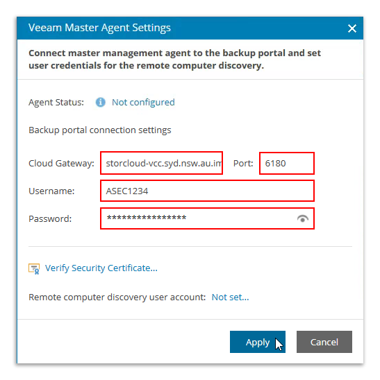 Step Eight: Fill in the Cloud Gateway, Port, Username and Password fields per the below.