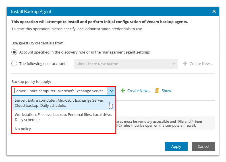 If none of the available backup policies in the drop-down suit your requirements, you can also create your own backup policies using the Create New... button.