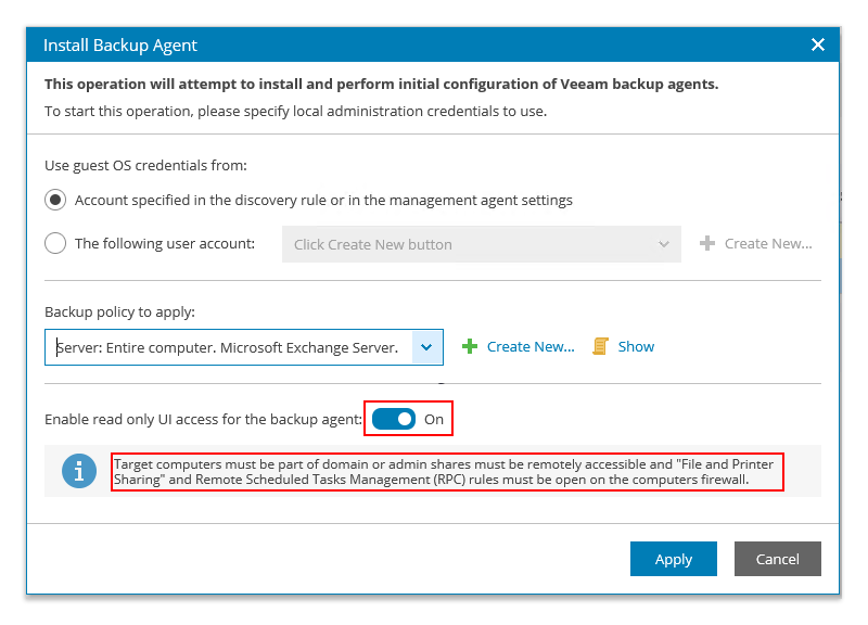 To prevent end user changes being made to the backup policy from a Workstation or Server directly, toggle the Enable read only UI access for the backup agent